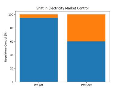 The chart compares regulatory control before and after the Electricity Act. In the pre-Act structure, Federal authority dominates almost entirely, with negligible State participation. In the post-Act structure, Federal control declines while State-level regulatory authority increases significantly, reflecting the emergence of decentralised Electricity governance.